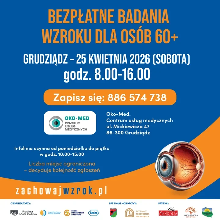 Wzrok potrafi pogarszać się po cichu, a pierwsze sygnały łatwo zrzucić na zmęczenie albo wiek. W Grudziądzu seniorzy dostaną jednak możliwość sprawdzenia go bez żadnych kosztów i bez czekania, aż problem mocniej da się we znaki. W sobotę rusza tu akcja, która ma wyłapać choroby siatkówki na etapie, gdy wciąż można zareagować spokojniej i skuteczniej. To propozycja przede wszystkim dla osób po 60. roku życia, a szczególnie dla tych, które zmagają się z cukrzycą.
