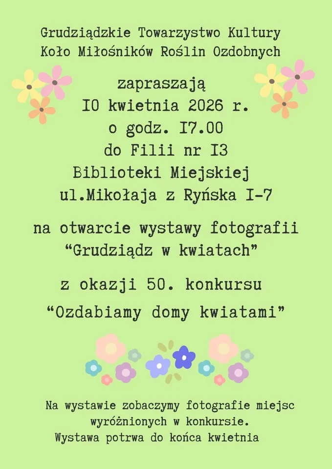Po świątecznym spacerze warto zajrzeć do biblioteki i zobaczyć coś naprawdę kolorowego Już 10 kwietnia o 17:00 w Grudziądzu otwiera się wystawa fotografii „Grudziądz w kwiatach” — pełna barwnych kadrów, kwiatowych aranżacji i miejskich detali, które na co dzień łatwo przeoczyć. To dobra okazja, żeby na chwilę zwolnić i przyjrzeć się, jak dużo uroku potrafią dodać kwiaty zwykłym domom i ulicom.